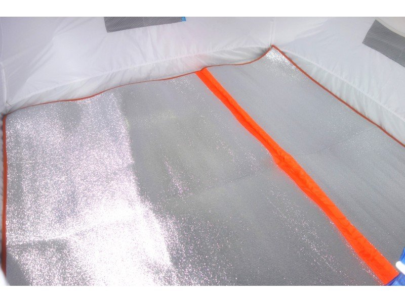 Размер в разложенном состоянии 210×225 см, сложенное состояние — по вашему усмотрению. Устанавливается внутри палатки. Изготавливается из пенофола, обшитого тканью и разделенного на 2 части.